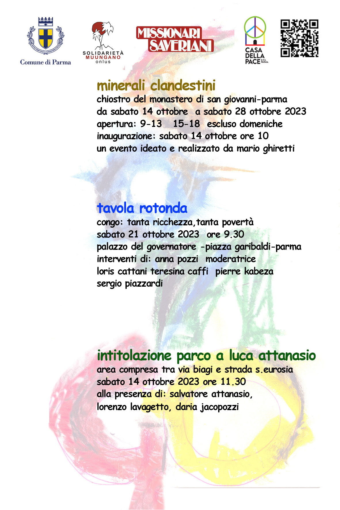 Nello stesso giorno alle ore 11:30 presso il parco compreso tra via Marco Biagi e strada di Sant’Eurosia Jaca si terrà inoltre l’intitolazione del parco a Luca Attanasio. Luca Attanasio fu diplomatico italiano ed ex ambasciatore presso la Repubblica Democratica del Congo e spese la sua vita per la costruzione di pace. L’evento si svolgerà alla presenza di Lorenzo Lavagetto, vice-sindaco di Parma; Daria Jacopozzi, assessora alla Partecipazione e Pace e Salvatore Attanasio, padre dell’ambasciatore.