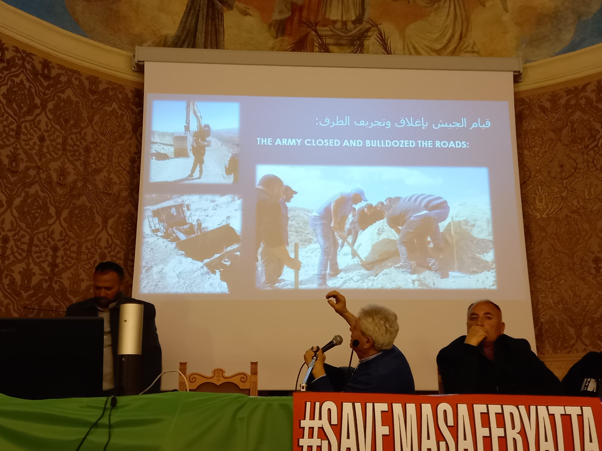 Con l’aiuto di un power-point sono state mostrate foto esaurientemente esemplificative dei soprusi ai quali i palestinesi vengono sottoposti e un video in cui due bulldozer israeliani distruggono una scuola costruita con i fondi UE.